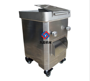 3、启动机器,将肉片水平放入下料口,然后将切好的肉片切成肉片。再次水平切割切割的肉片,形成肉丝,重复几次,形成肉粒。